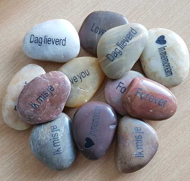 Mooie gladde kleine steentjes met tekst als herinnerings- of knuffelsteen voor op het graf of voor thuis.